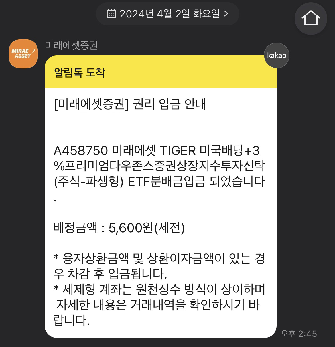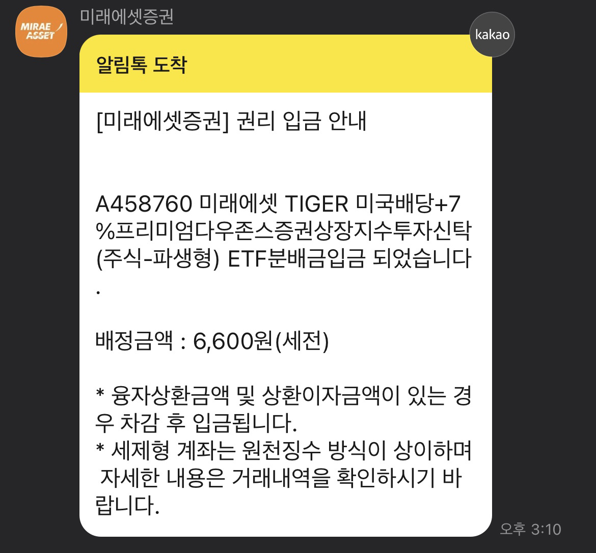 바로 타이거 미국배당 다우존스 +3% 배당금이 들어왔기 때문입니다.