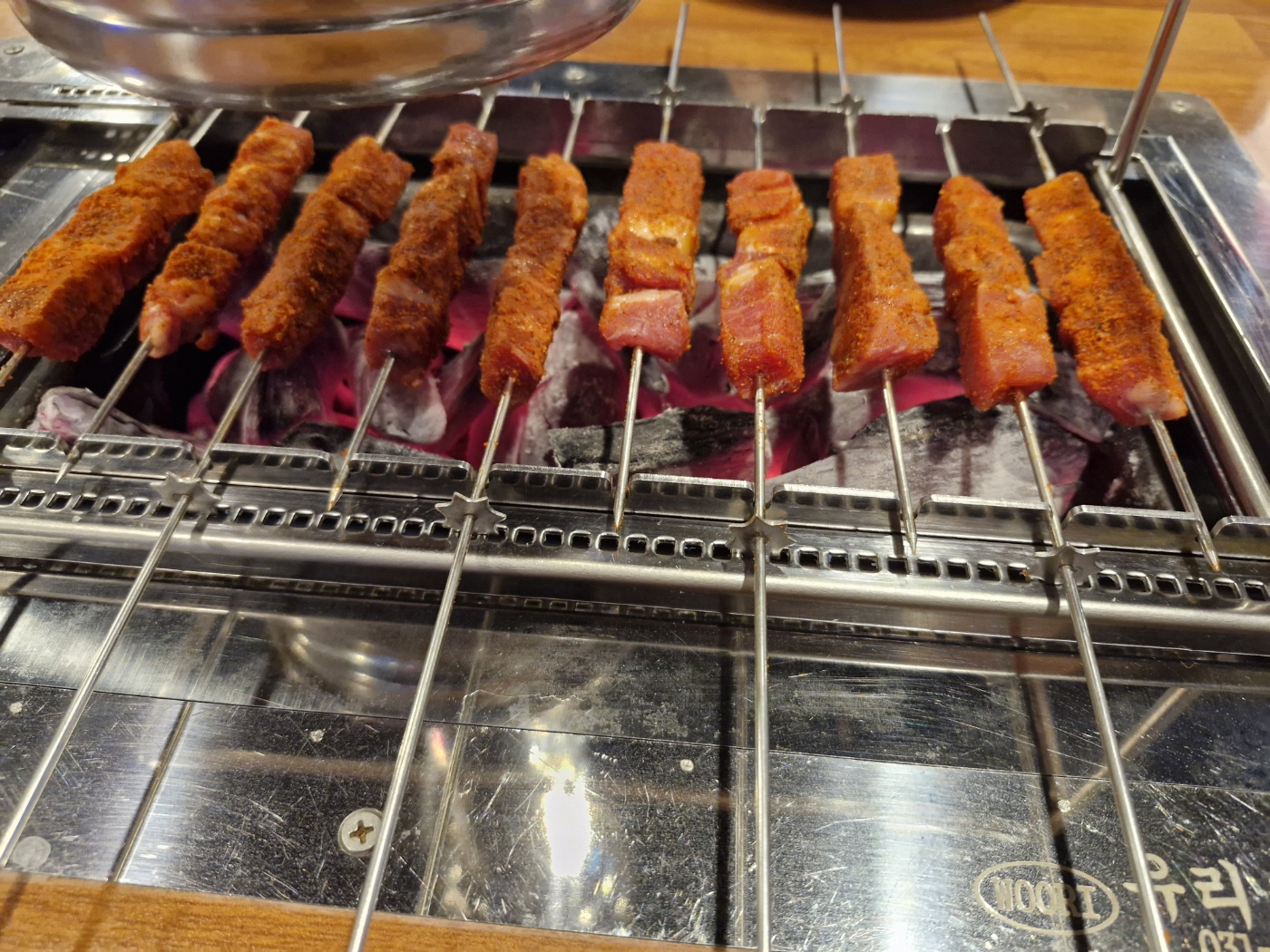 차곡 차곡 불판에 양고기를 올립니다.