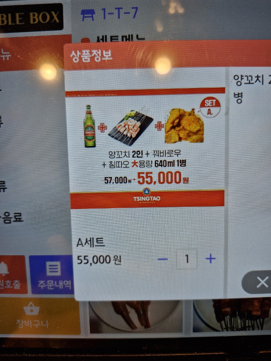 칭따오+양꼬치 2인+꿔바로우 세트에 55,000원 입니다.