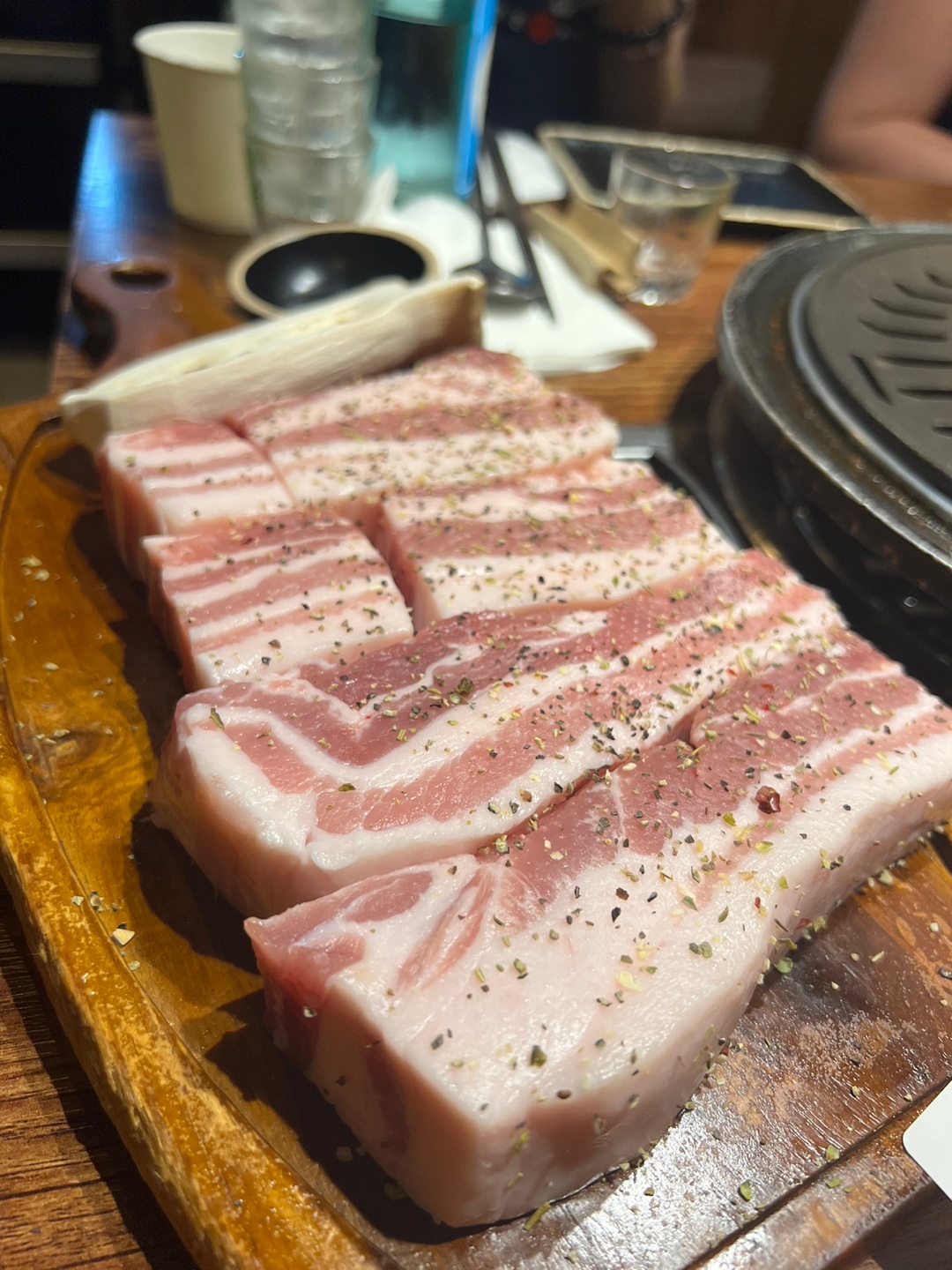 삼겹살이 나왔습니다. 저희는 가장 기본으로 시켰고 두툼한 삼겹살에 갑자기 배가 너무 고파지더라구요