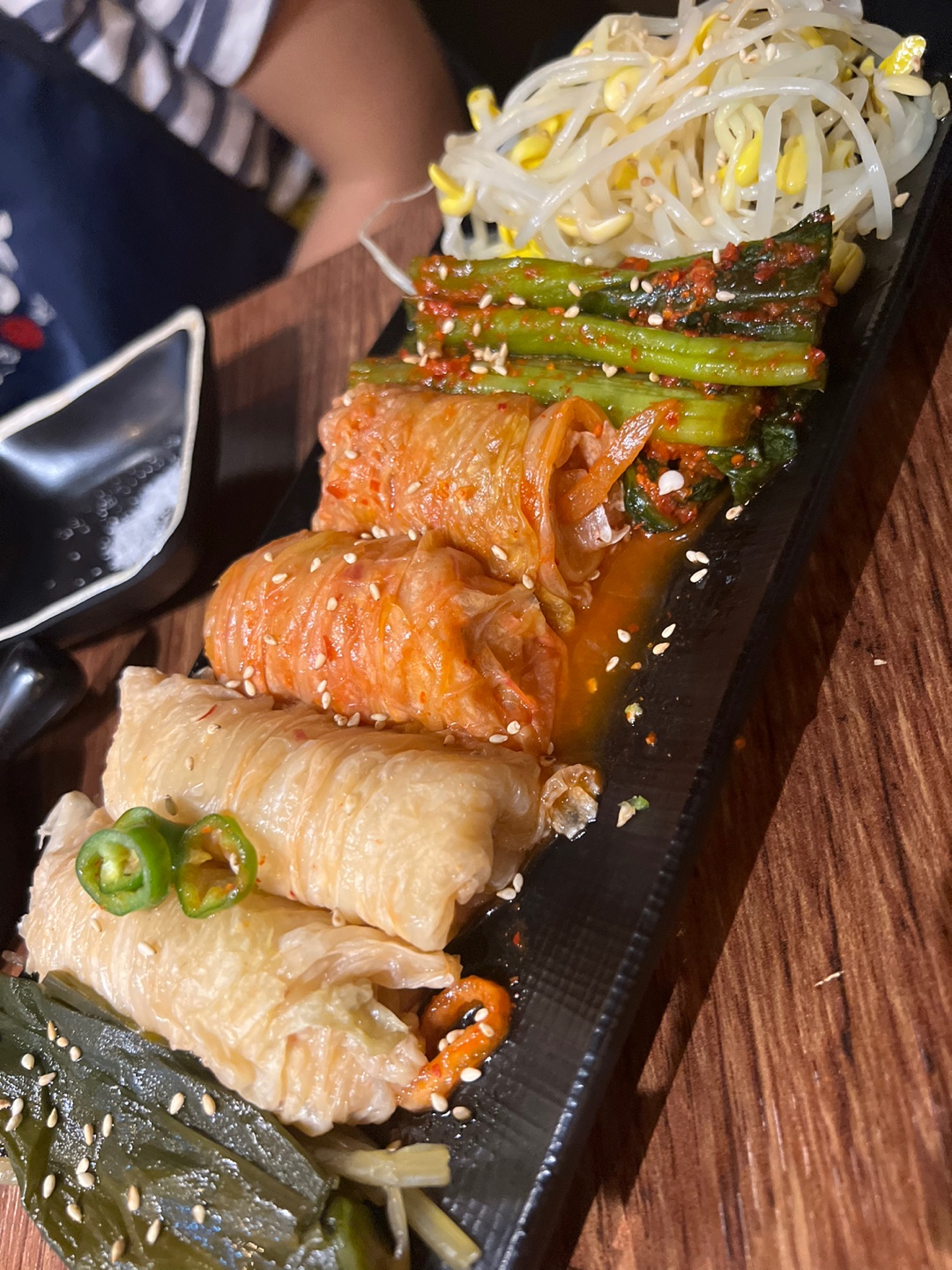 명이나물 과 각종 김치들이 나왔습니다. 친구들이 김치를 너무 좋아한다고 했고 다양한 김치 구성이 예쁘게 말아져 나와서 연신 프리티를 연발했어요. 이 김치를 버터와 참기름 둘중에 하나를 정해서 불판에 굽게 됩니다.