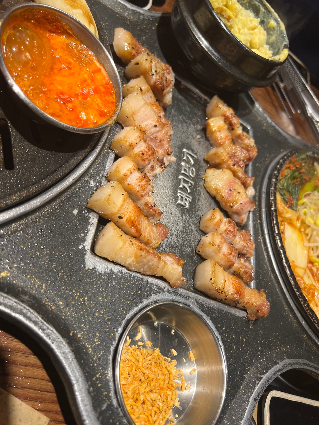 고기가 다 익으면 불판 중간에 집어먹기 편하도록 스태프 분께서 놔주세요. 건새우 칩, 고추냉이, 소금등 원하는 양념에 찍어먹으니 너무 꿀맛입니다. 외국인 친구들이 왜 좋아하는지 알겠더라구요. 쫄깃쫄깃하고 육즙이 팡 터집니다. 멜젓도 너무 맛있었어요. 외국인한테 간이 너무 쎄지 않을까 싶었는데 좋아하면서 잘 찍어 먹더라구요? 허허