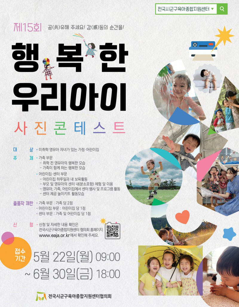 벌써 15회 차 라는데요. 이번에도 전국 시군구 육아 종합 지원센터 협의 회에서 제 15회 행복한 우리아이 사진 콘테스트를 개최한다고 합니다.