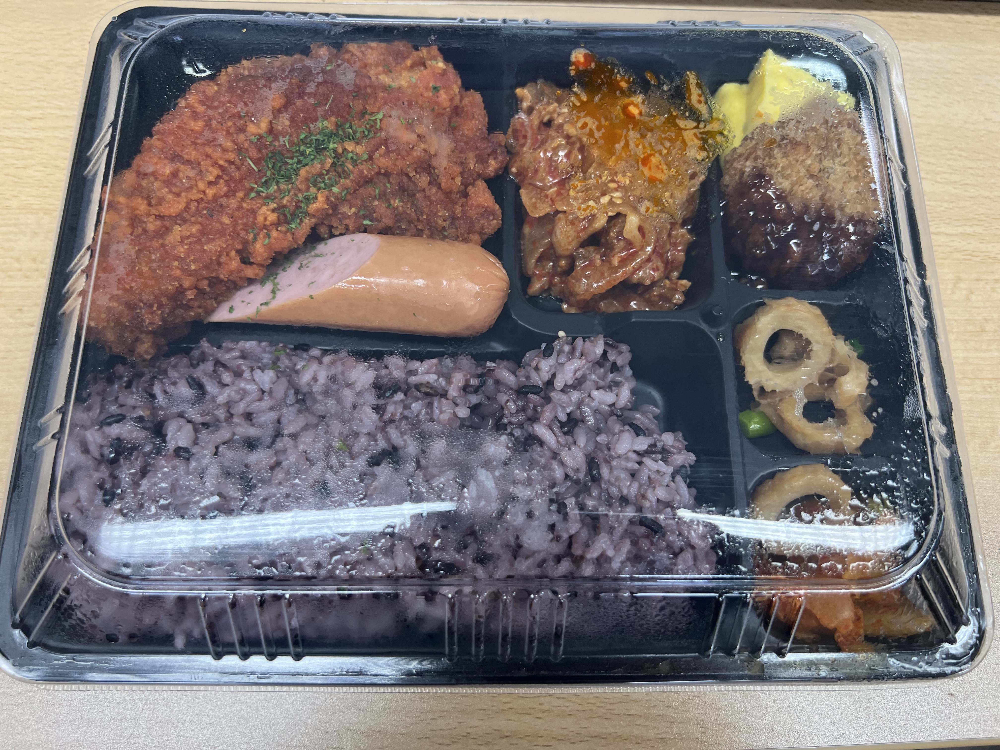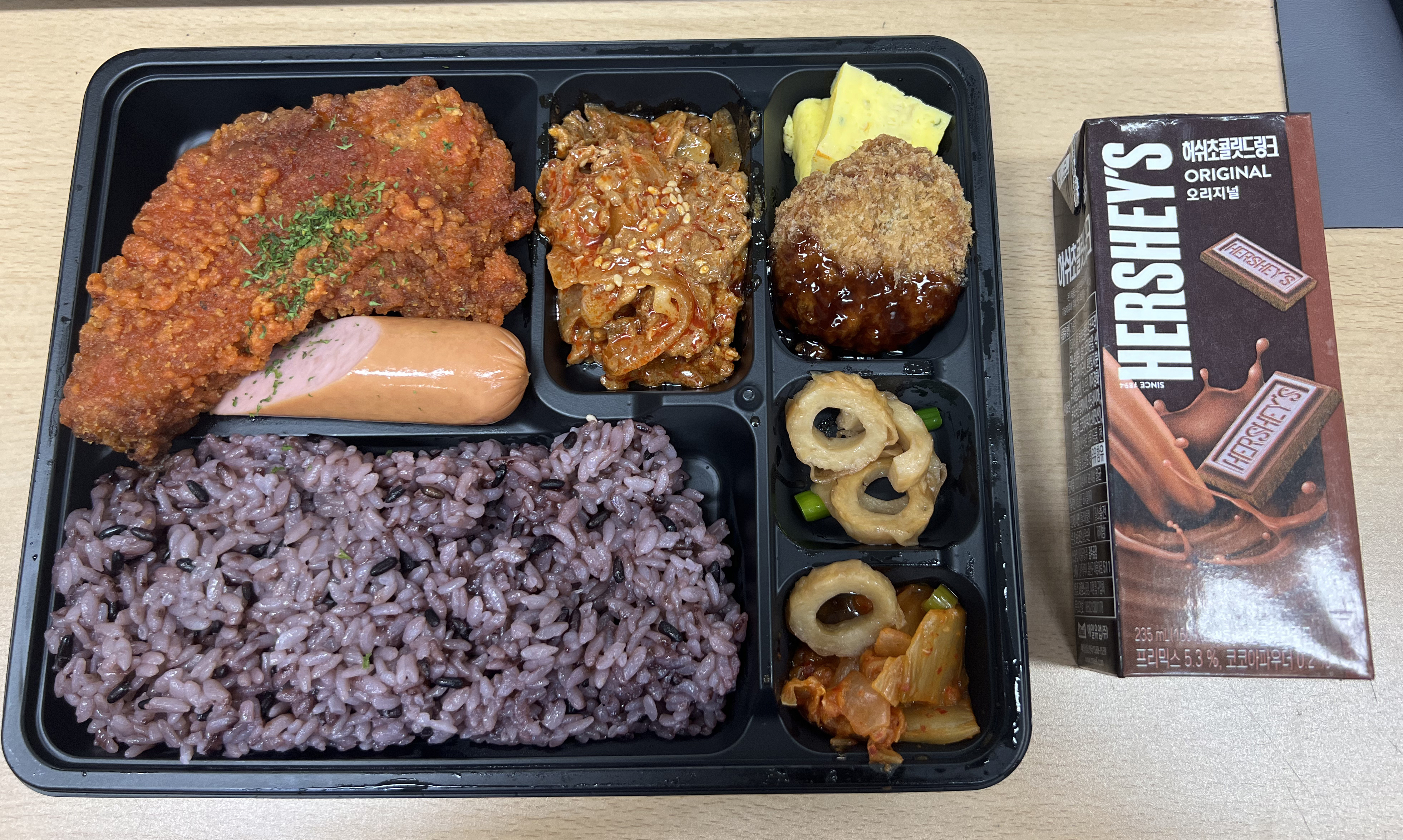 구석은 큰 매콤한 닭다리,소세지 반쪽, 흑미밥, 제육볶음 약간, 고로케 하나, 계란말이 2조각, 오뎅볶음, 김치 입니다.