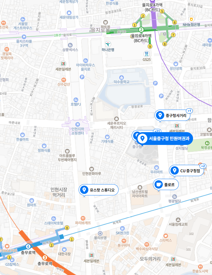 서울 중구청 민원여권과는 3,4호선 충무로역과 2호선 을지로 4가 역 사이에 있습니다.