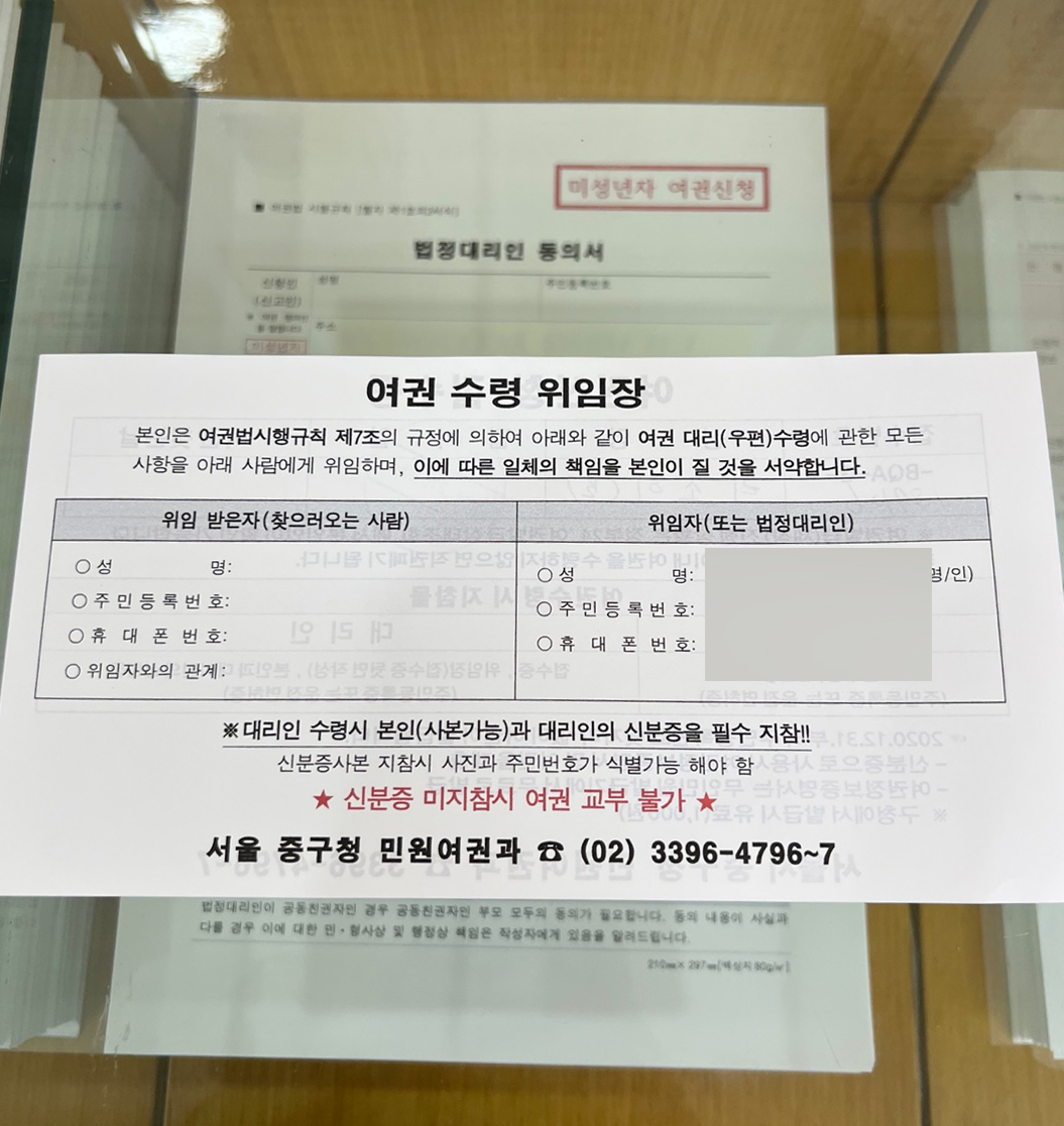 아기 여권을 만들때 제출 해야할 서류는 사진에 보이다 시피 여권발급 신청서 와 법정대리인 동의서 각 1부씩 현장에서 작성하여야 합니다. 그리고 법정대리인 동의서는 부모중 한쪽만 방문하여도 부와 모의 정보 모두 적어주셔야 합니다.