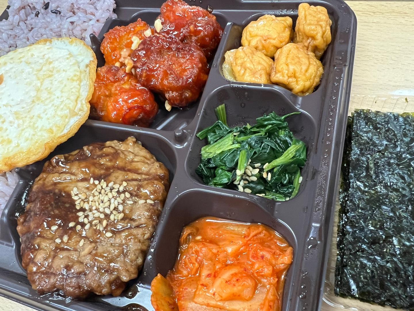 그리고 닭강정 4조각과 적당한 크기의 너비아니, 오른쪽은 윗줄부터 오뎅 4개와 시금치 나물, 볶음 김치가 들어있습니다.