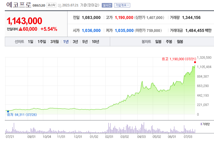 거품이라는 말도 많았지만 무색하게 100만원을 쉽게 돌파하고 최고가 1,190,000 를 찍었습니다.
