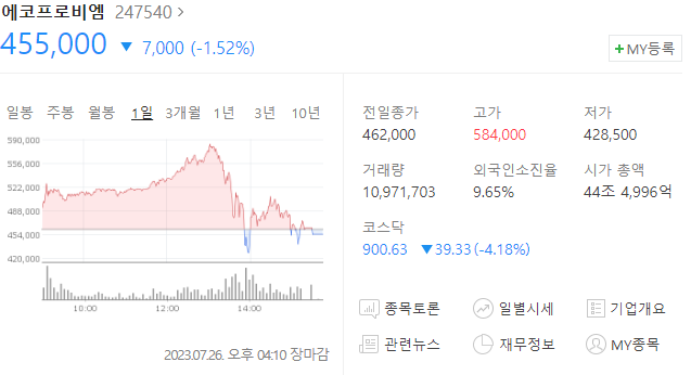 이날 코스닥 시장에서 에코프로비엠 공매도 거래량은 80만 6750주였고 공매도 거래 대금은 4133억에 달했다고 하는데요, 에코프로비엠의 거래대금인 5조6280억원에 7.82 프로에 해당하는 꽤나 큰 비중입니다.
