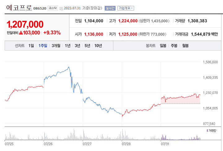 2023년 7월 우리나라에서 가장 주목받는 주식 중 하나인 에코프로는 7/31 일또한 전일보다 +9.33% 오른 1,207,000원으로 마감하여 당초 공매 세력의 공격에도 불구하고 주가가 계속 오르고 있습니다. 7월 마지막주는 주가가 오르락 내리락 하여 보는 내내 감탄과 한숨이 절로 나오는 주이기도 했습니다.