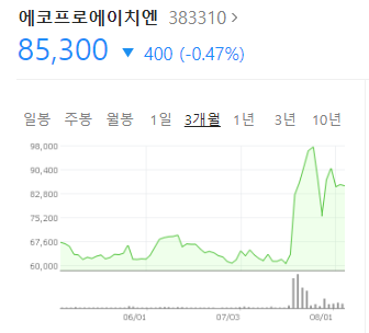 간단하게 지난 3개월간의 에코프로에이치엔 주가를 살펴보면,