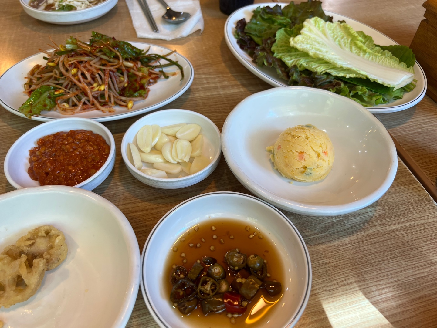 콩나물 무침, 상추, 깻잎, 쌈장, 연근전, 감자샐러드 등 입니다.
