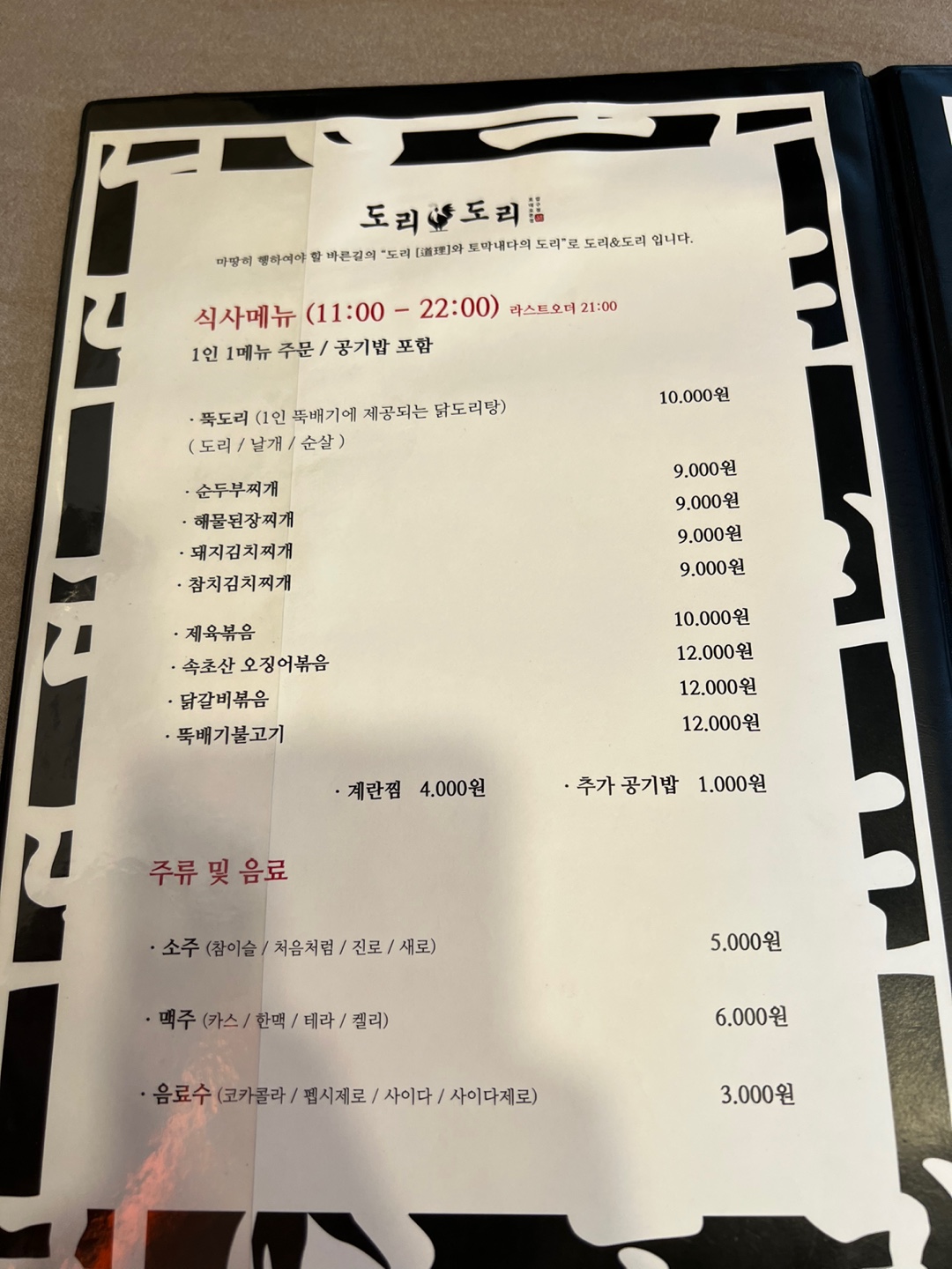 압구정 로데오 맛집인 도리도리의 식사 메뉴판입니다.