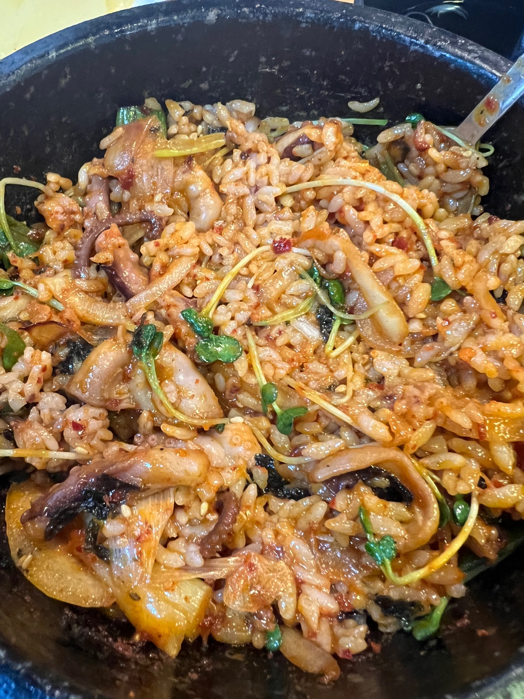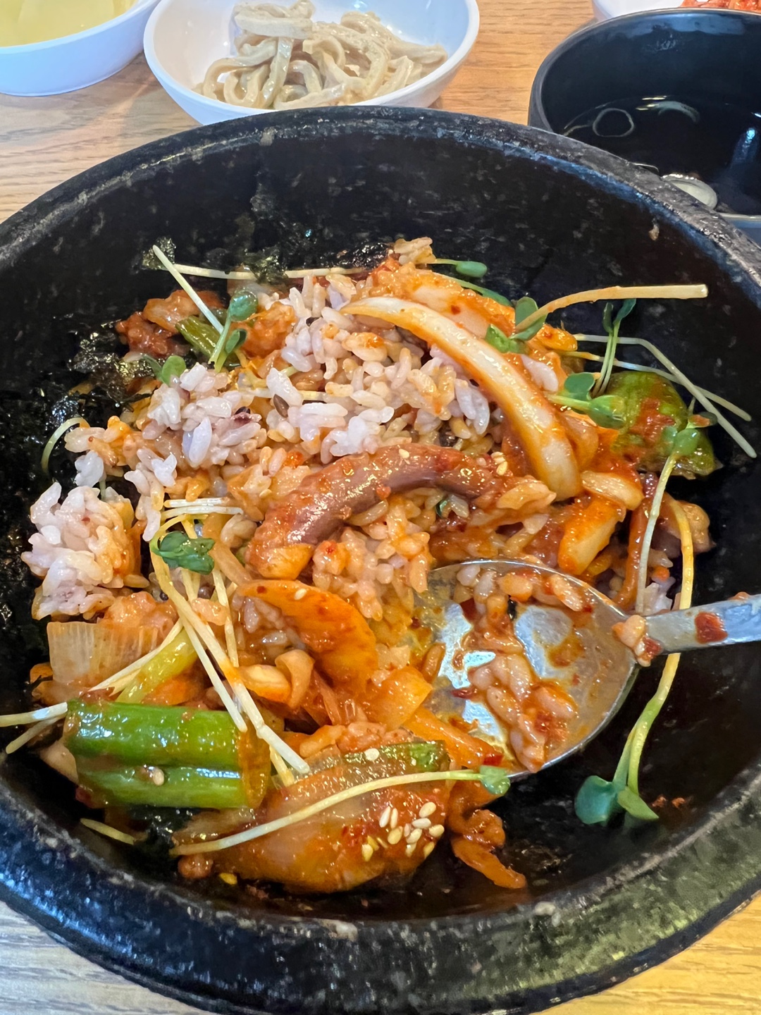 지글지글한 돌솥에 낙지와 비빔밥이 나와서 나중에 솥에 눌러붙은 밥을 긁어먹는 것이 일품입니다.