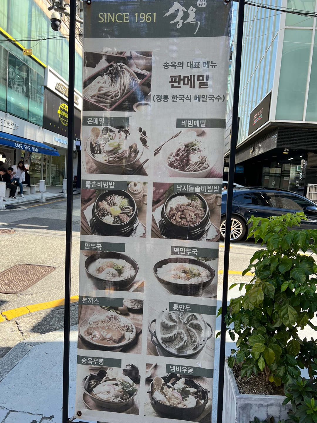 송옥의 대표 음식들이 문 옆에 세워져 있습니다.
