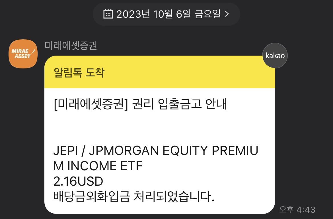 2023년 10월 6일 금요일 오후 4:43분 미래에셋에서 카톡이 왔습니다.