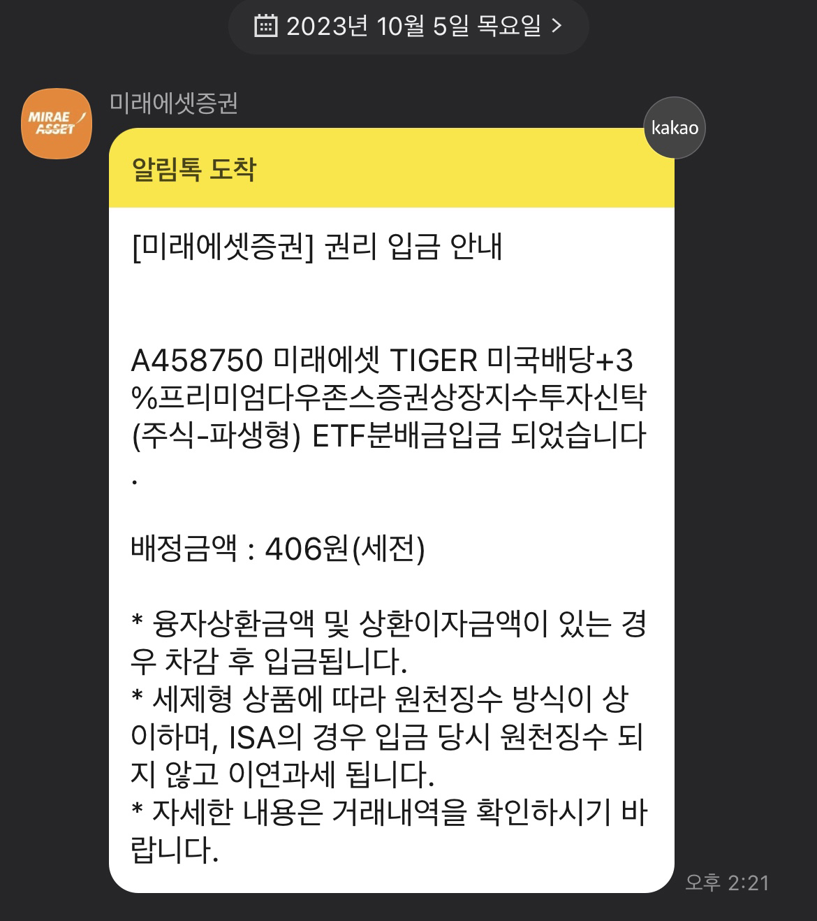2023년 10월 5일 목요일 오후 2:21 분에 미래에셋에서 카톡이 옵니다.