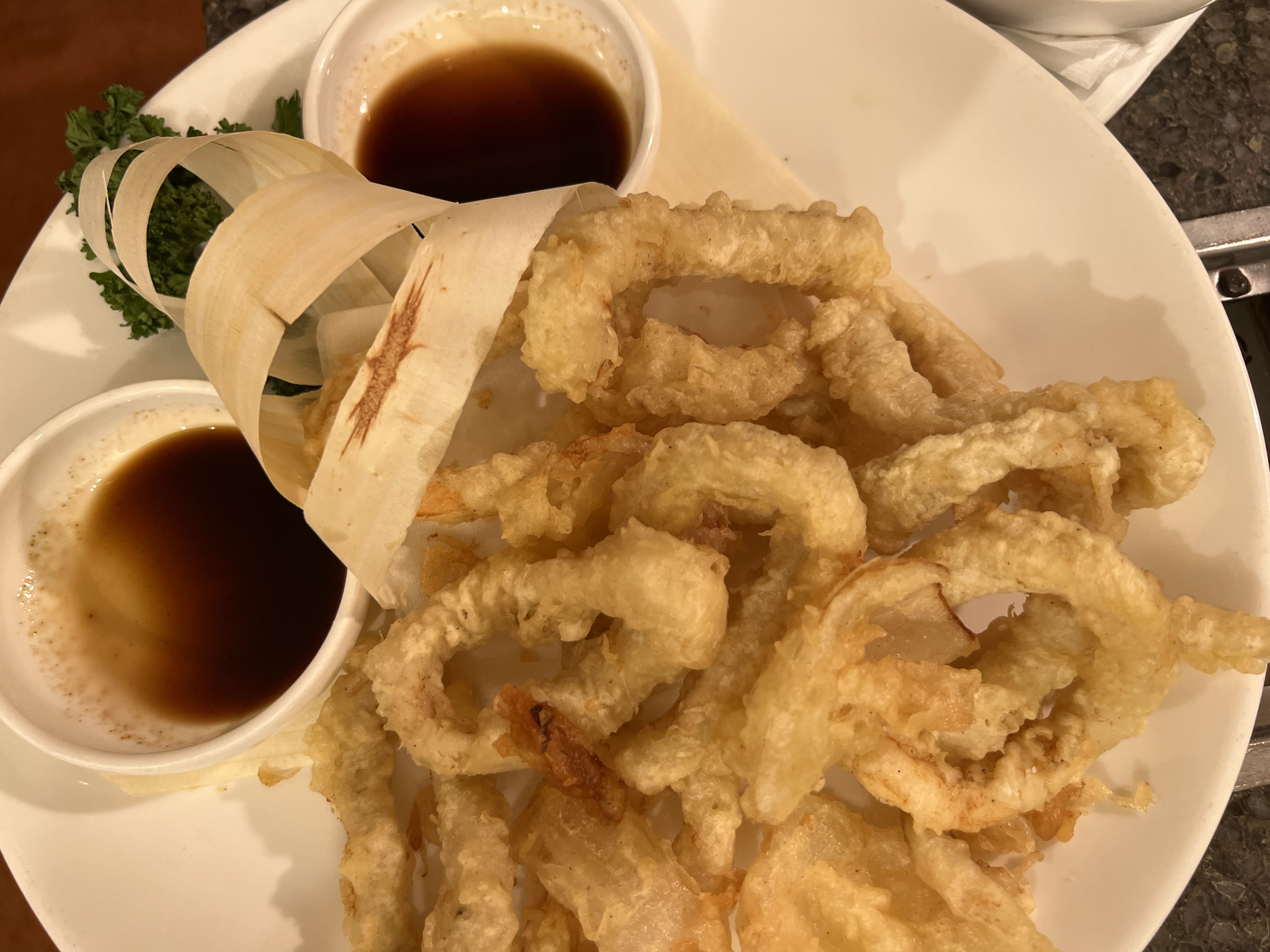 바삭바삭한 튀김옷과 와사비가 섞인 간장 이 오징어와 잘 어울립니다.
