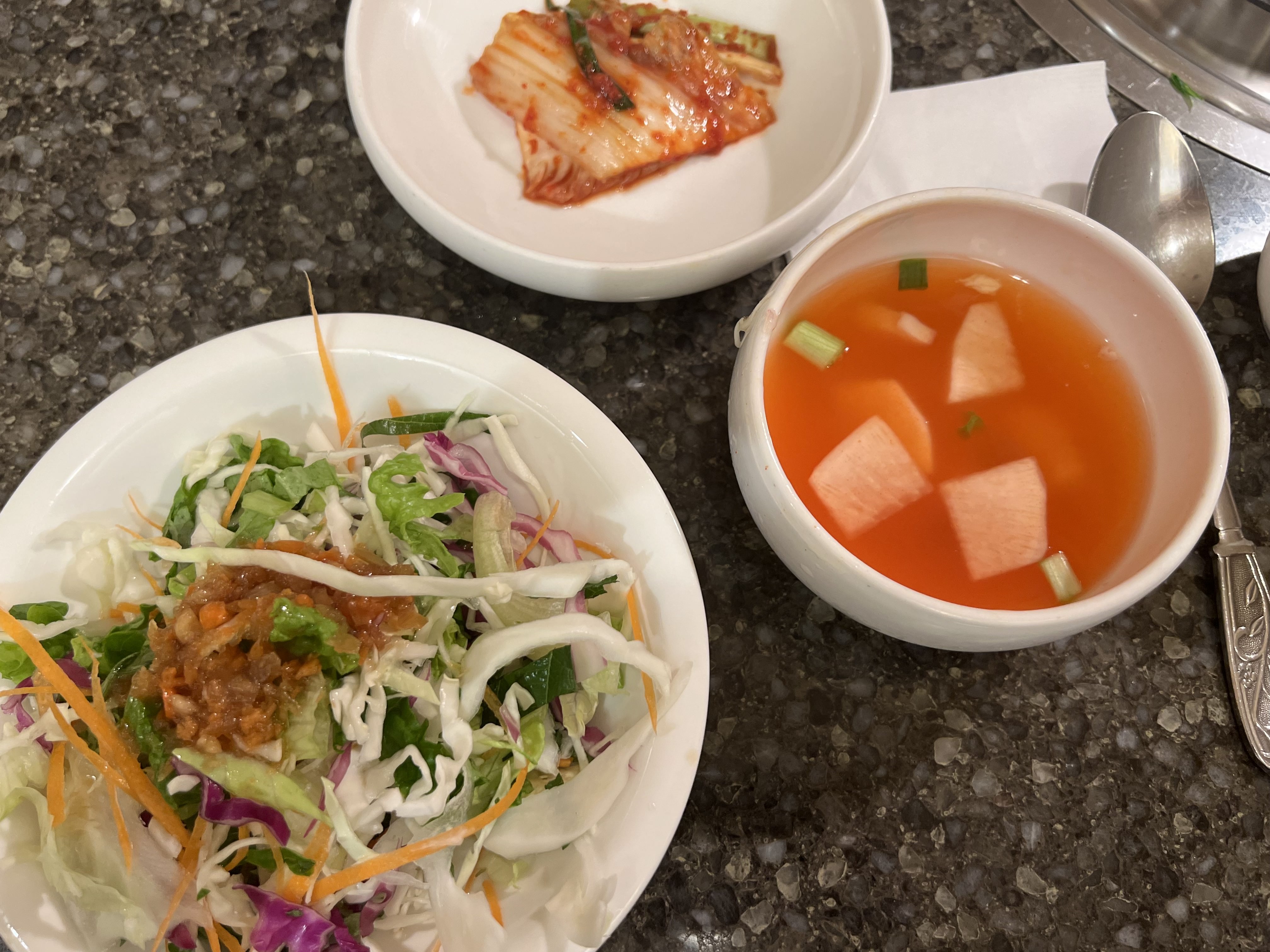 야채 샐러드와 물김치, 미역초무침, 배추김치 가 나왔습니다.