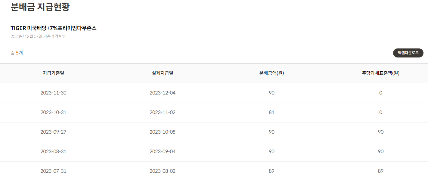 다음은 타이거 미국배당 +7% 프리미엄 다우존스의 12월 분배금 입니다.