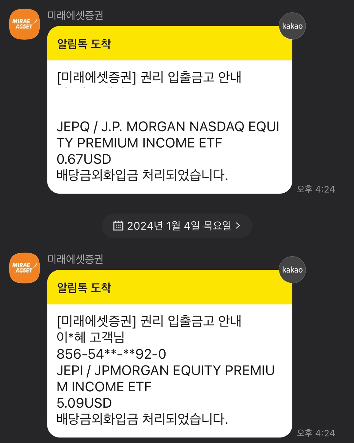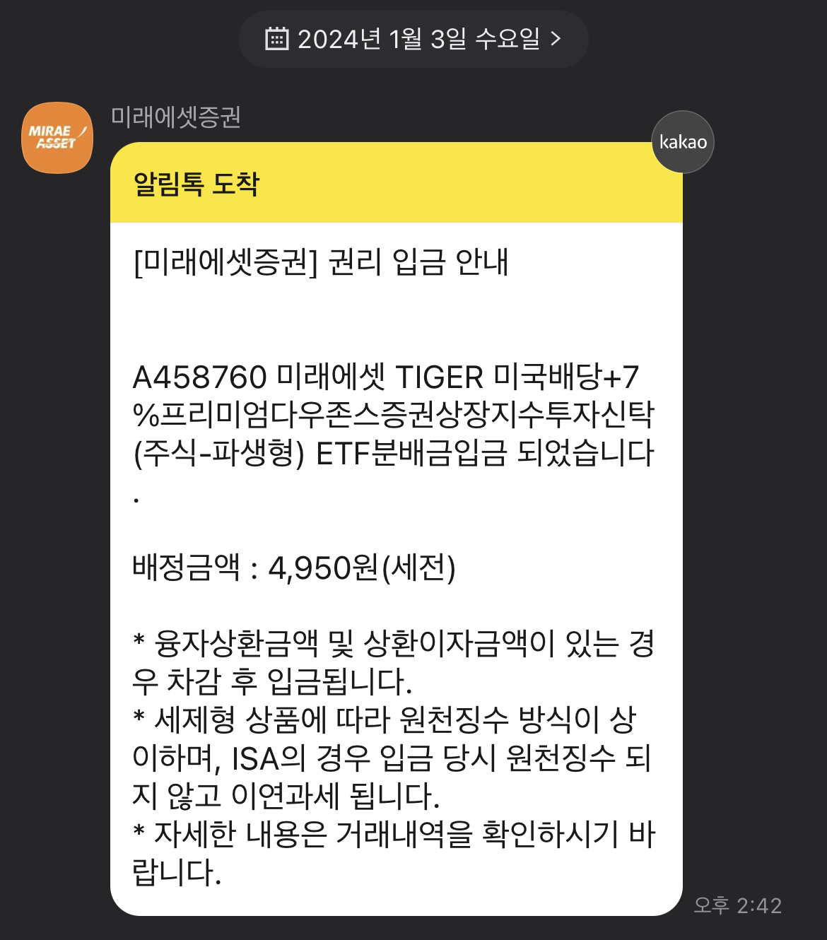 1월 3일에 분배금 카톡이 울렸습니다.